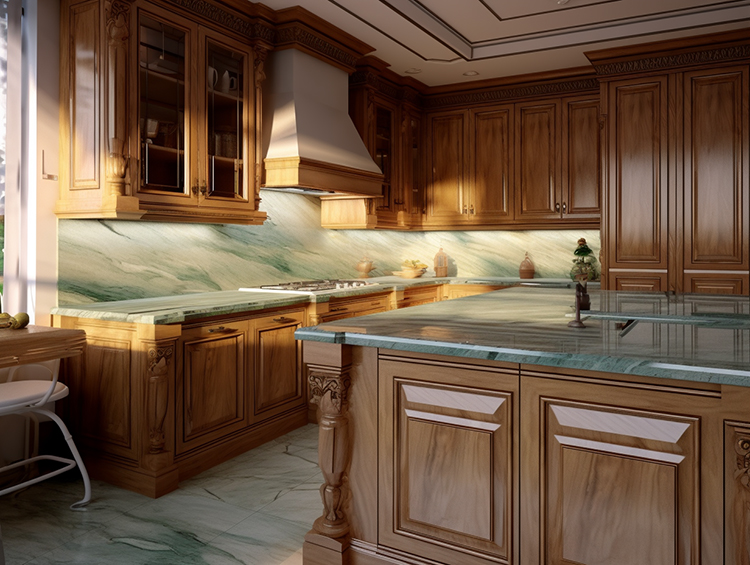 A classic yet vibrant design choice when paired with Gaya Green quartzite countertops and brown cabinets. Brown cabinets bring warmth and stability to the kitchen while blending with natural tones to create a cozy atmosphere. Green countertops inject vitality and freshness into the entire space, making the kitchen full of vitality and natural charm.