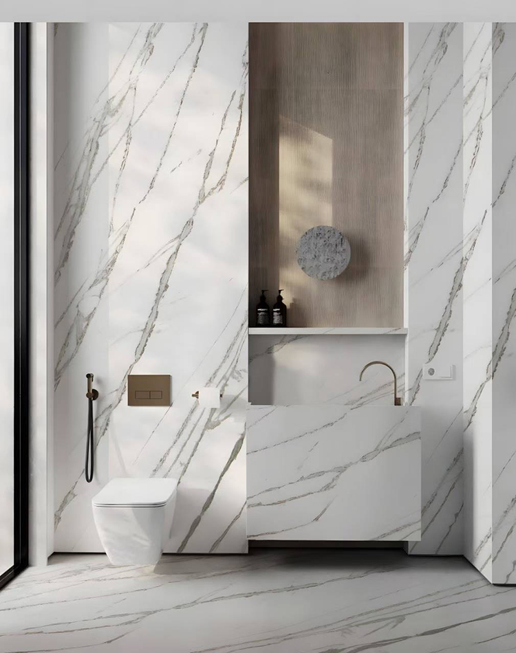 Bathroom walls/countertops: Creates a luxurious hotel bathroom experience.